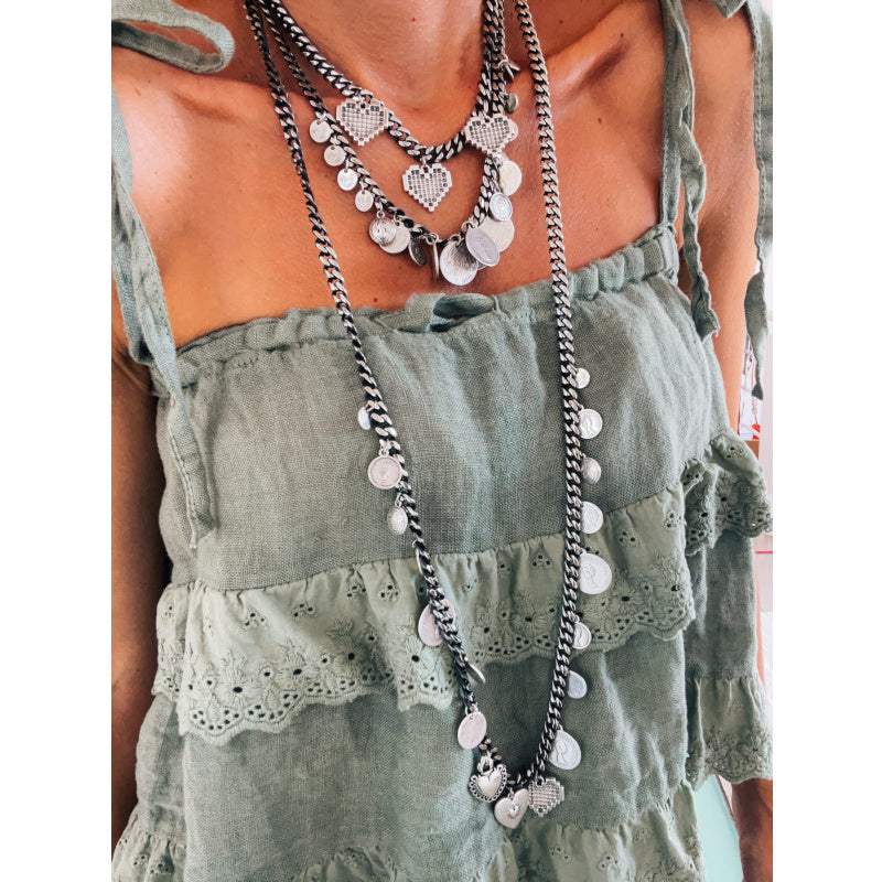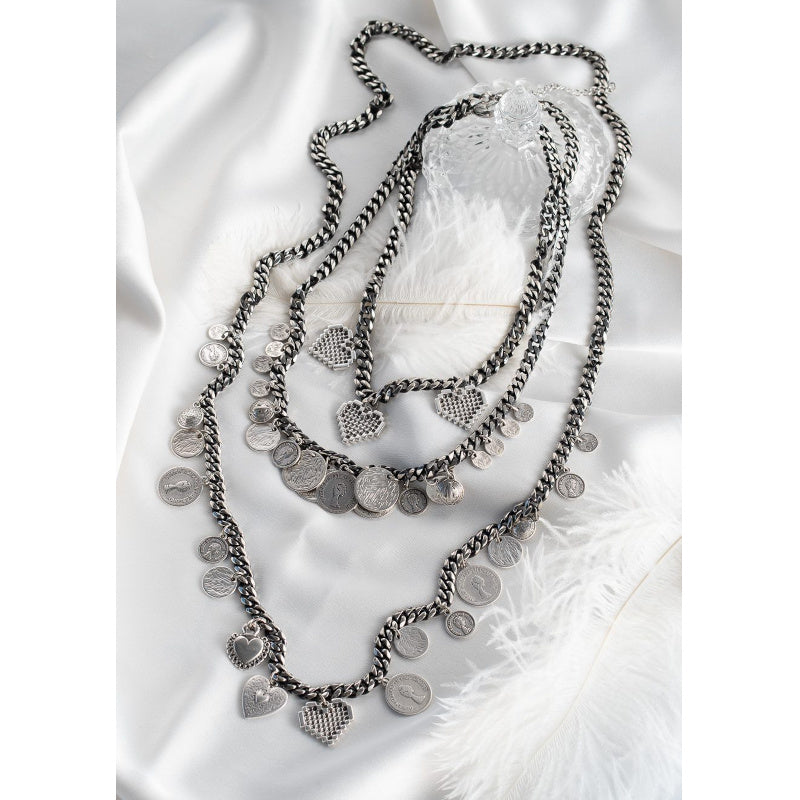 ROCK THAT LOOK ! Geschwärzte, antiksilberfarbige Halsketten mit antiken Münzen und Herzanhängern. Auffälliger, aber leichter Schmuck - perfekt für Layering ❤︎