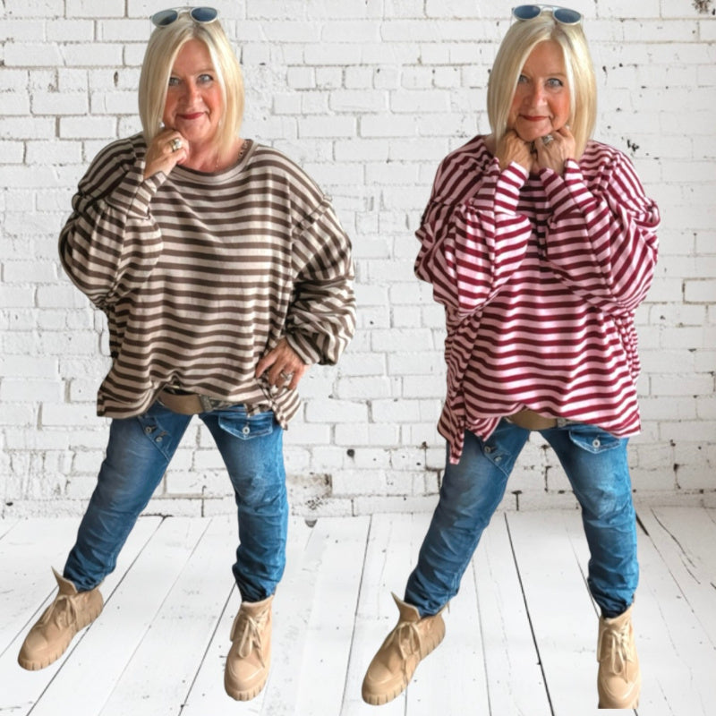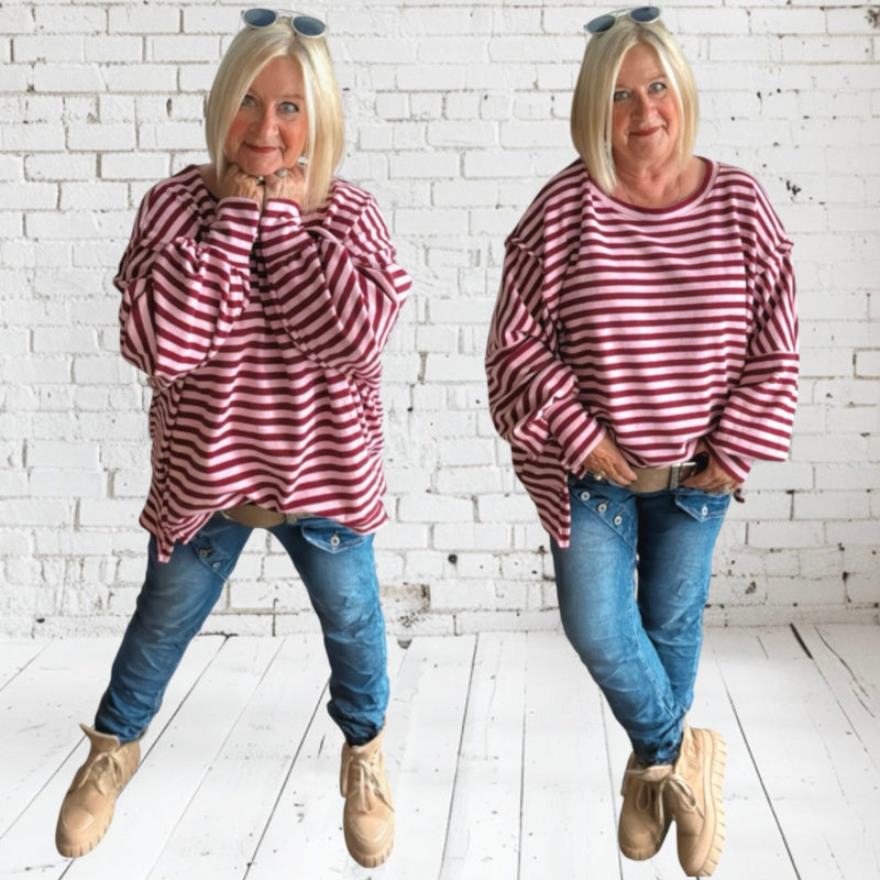 Der stylische Baumwoll-Pulli mit Rundhals-Ausschnitt "STRIPES ON TOP" besticht mit seinen herrlichen Farbkombinationen. Modisches Detail: nach außen gelegte Ziernähte und geschlitzte Bündchen am Ärmel. Der Pulli ist kastig und in oversize geschnitten, sowie seitlich geschlitzt für eine gute Passform. Der hochwertige Baumwollmix bietet einen angenehmen Tragekomfort. Ein mega cooler Look und ein wahrer Hingucker - in 2 Farbkombinationen❣️ ⚜️ Style Tipp: besonder lässig wirkt der Pulli mit einer stylischen Jeans- Farben: bordeaux/rosa, braun/beige