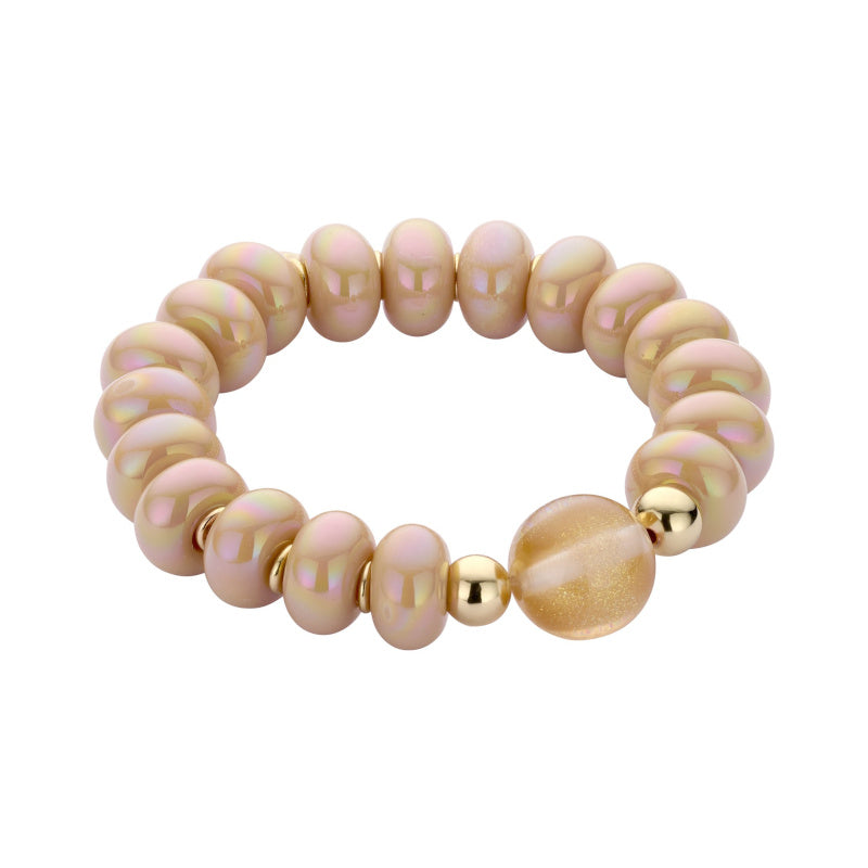 Frühlingshaftes Armband aus wunderbaren Disc-Perlen aus Harz, goldfarbigen Zwischenelementen und einer großen Glasperle als "Center Piece", mit Biba-Charm. 💖