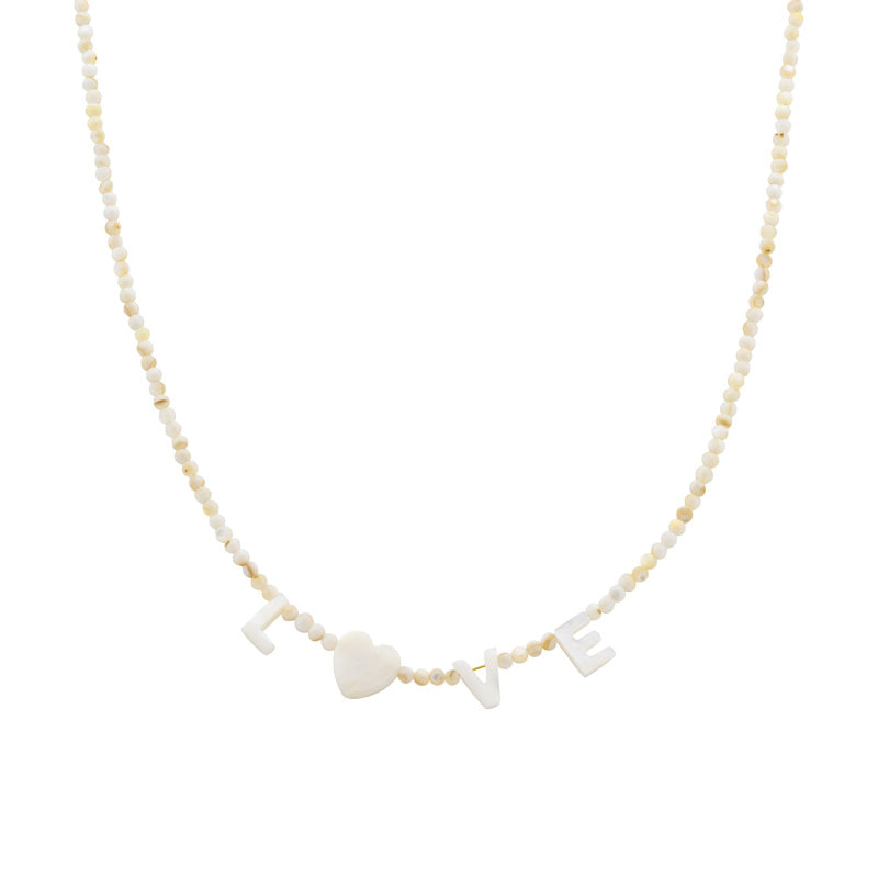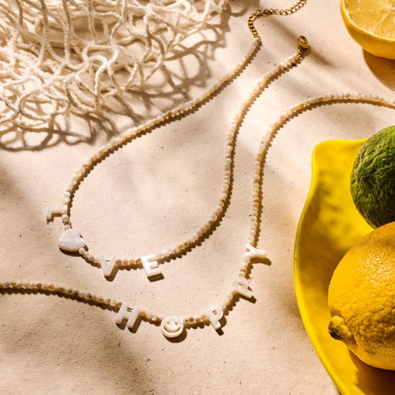 Zierliches Halskette aus runden Natursteinperlen mit einem wunderbaren Schriftzug aus Muschelperle, mit Biba-Charm. - in 2 verschiedenen Designs 🐚