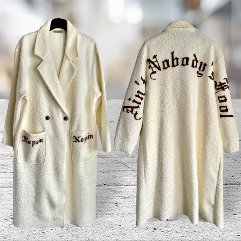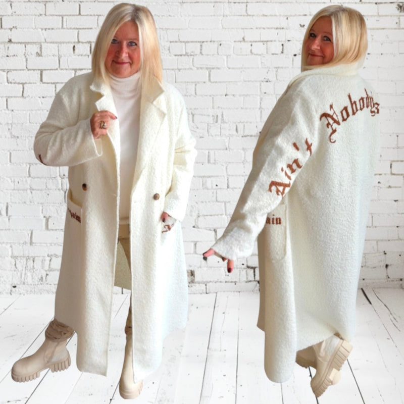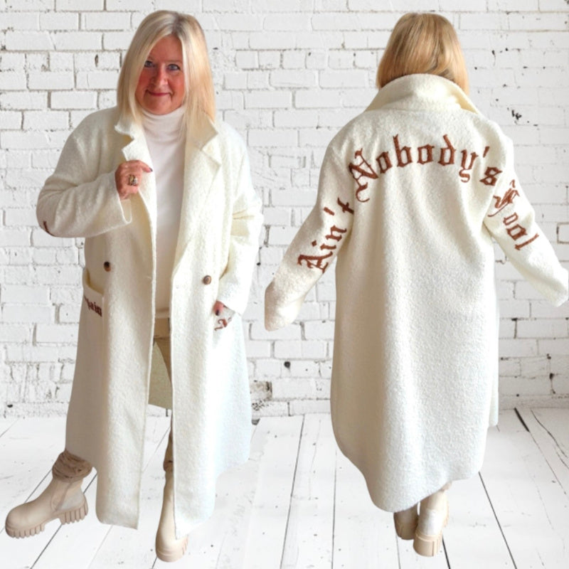 Stilvoller Bouclé-Mantel "NOBODYS FOOL" mit großem Revers und 2 großen, aufgesetzten Taschen. Der grob anmutende, aber weiche Stoff mit der typschen Bouclé-Struktur hat etwas Luxuriöses, Zeitloses und Elegantes. Besondere Details: großer Statement Print "Ain't nobodys fool" über Rücken und Ärmel; kleiner Print "no pain" "no gain" auf den Taschen. Der Mantel wird mit zwei naturfarbigen Knöpfen geschlossen und ist modern und stylisch zugleich. Der Bouclé-Mantel ist ideal für stilvolle Alltagslooks mit Wohlfühlfaktor und hält dazu auch noch schön warm 🤍