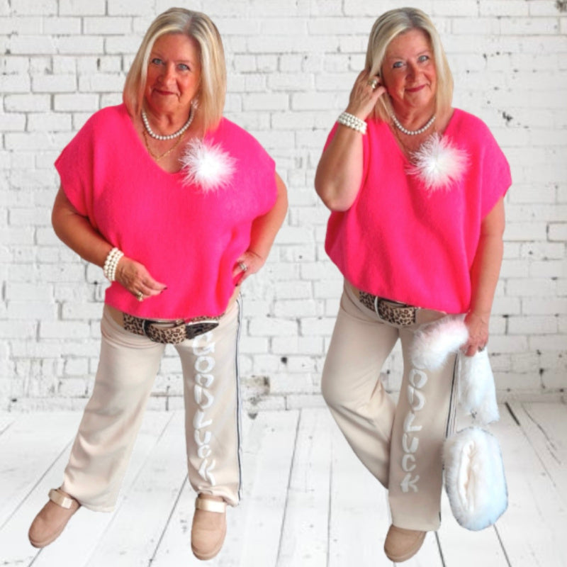 Die stylische Marlene Hose "GOOD LUCK" mit elastischem Bund begeistert mit dezenten Farben und trendigen Galonstreifen. Besonderes Detail: großer Print "GOOD LUCK" auf dem linken Bein. Der ausgefallene Schnitt mit weitem Bein verleihen ihr eine stylische Note und lässt die Hose sowohl sportlich als auch zeitlos und modern wirken. Der hochwertige Viskosemix sorgt sie für einen bequemen Tragekomfort und eine flexible Passform - ein MUST HAVE in beige oder schwarz! 🤍🖤