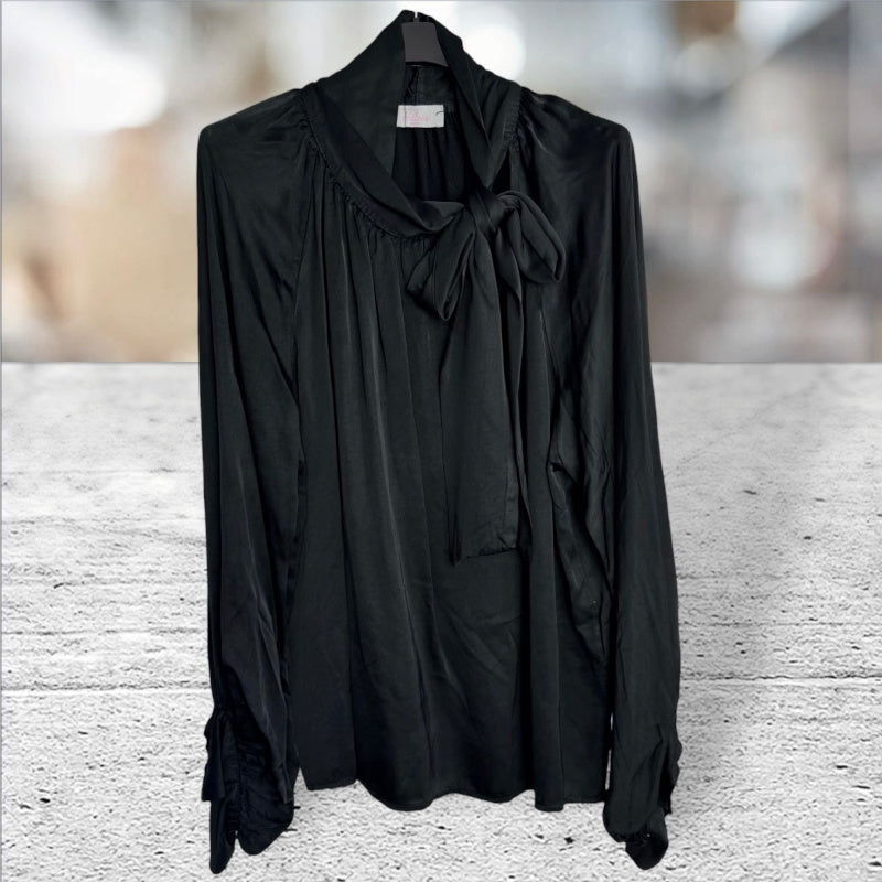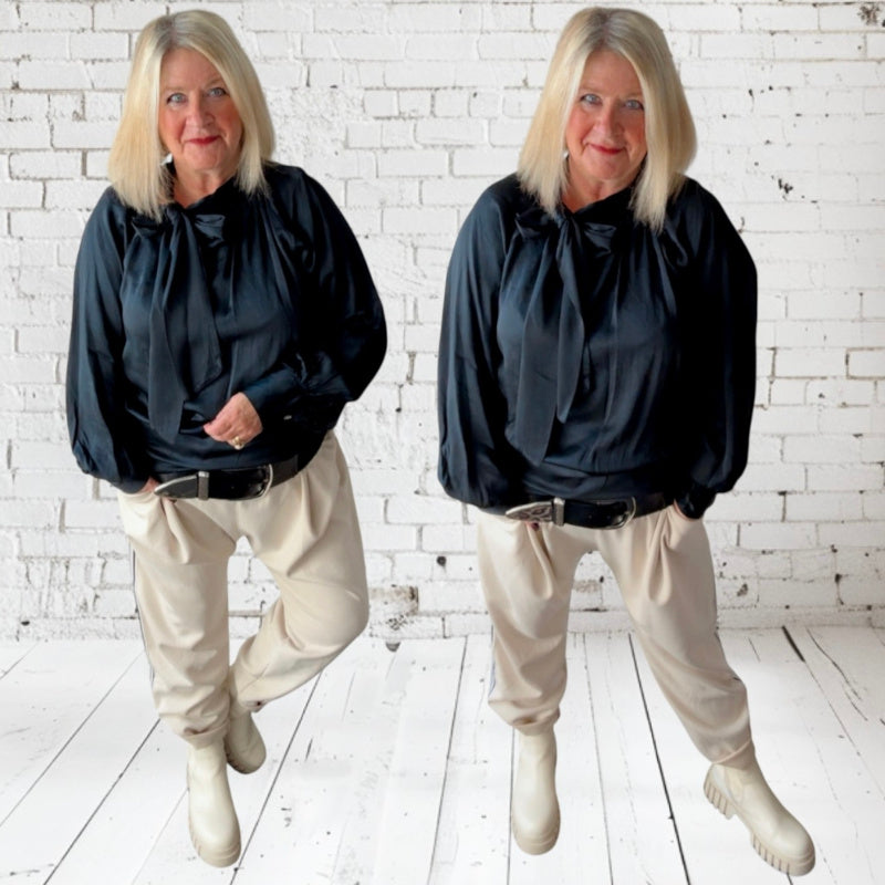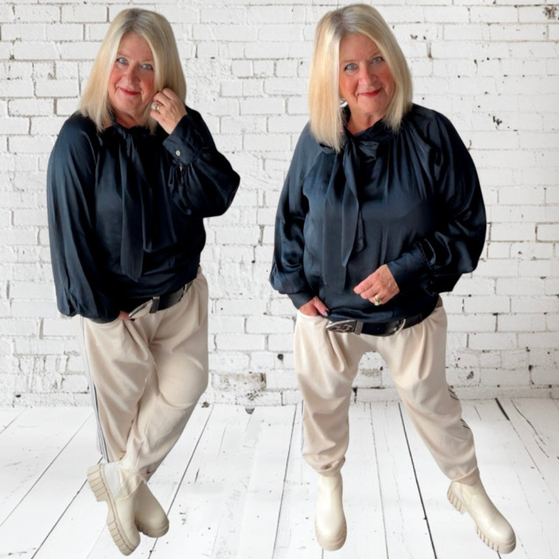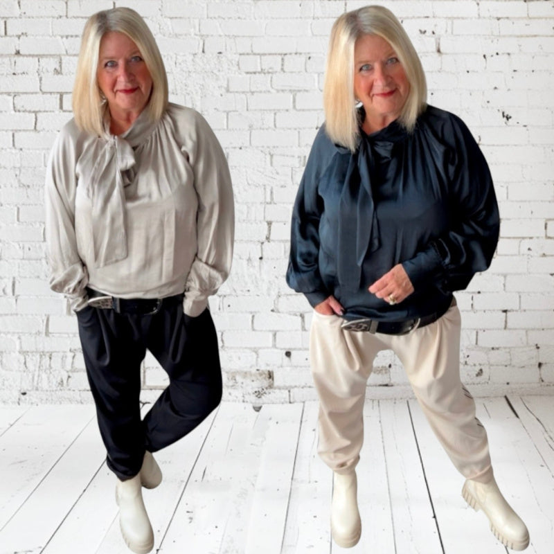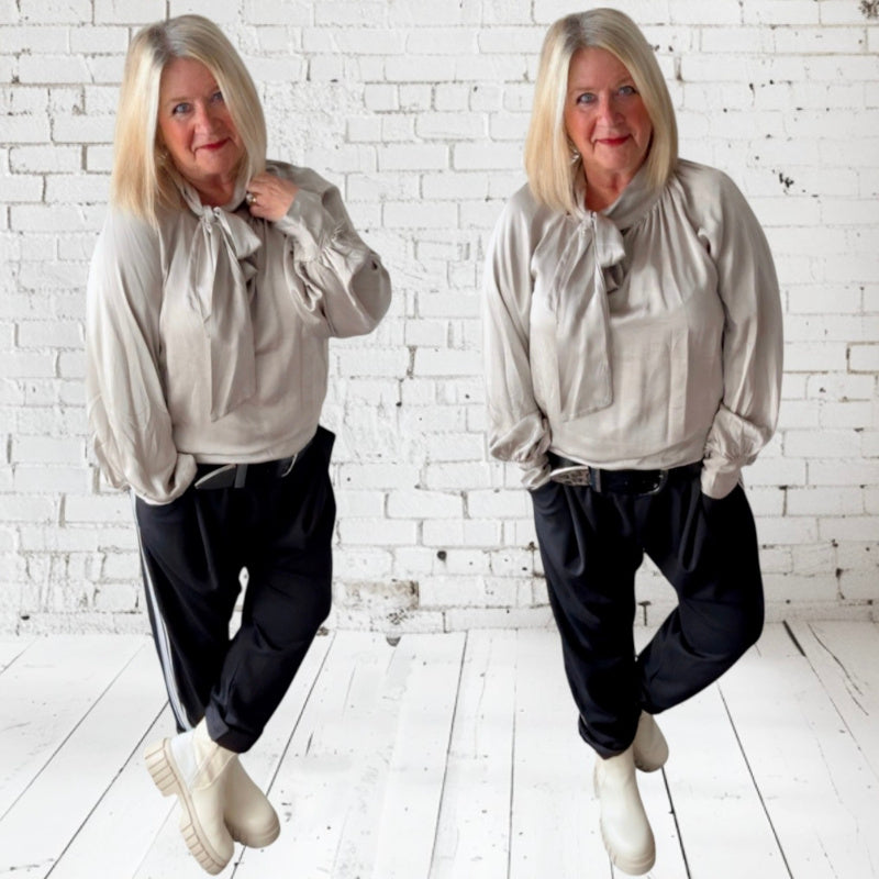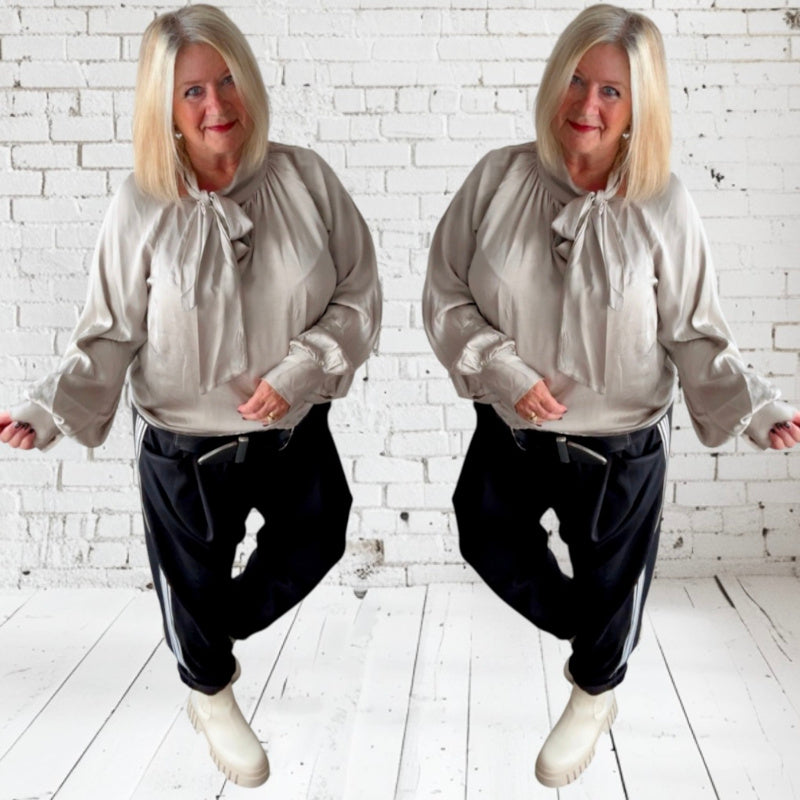 Elegant und zeitlos: Die Satin Bluse "RIBBON" in stein oder schwarz ist ein echter Klassiker. Der lässige Schnitt macht diese Bluse ideal für den Alltag aber auch für besondere Anlässe. Perfekt durchdachte Details: Der Schalkragen mit großer Schleife und die weiten Ärmel verleihen der Bluse eine elegante Note. Die Schlupfform sorgt für unkompliziertes Anziehen, während der feminine Schnitt maximalen Tragekomfort bietet. Der hochwertige Viskose-Seide-Materialmix fühlt sich angenehm leicht auf der Haut an.