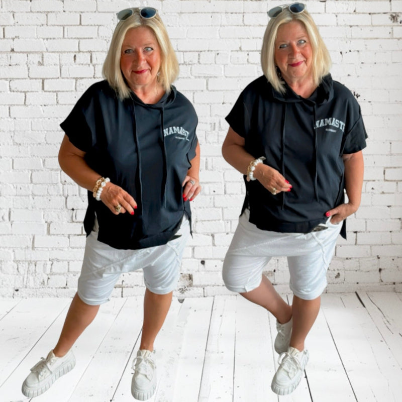 Das stylische Shirt "NAMASTE" mit Kapuze besticht durch einen lässigen Schnitt und einem kontrastfarbigen Statement vorne und hinten als modischen Hingucker. Das Shirt ist kastig und hinten etwas länger geschnitten, sowie seitlich geschlitzt für eine gute Passform. Modisches Detail: nach außen gelegte Ziernähte. Der hochwertige Baumwollstoff sorgt für eine angenehme Haptik und maximalen Tragekomfort. Perfekt für trendige Casual-Looks. - erhältlich in 4 Farben- Farben: weiß, schwarz, taupe, khaki