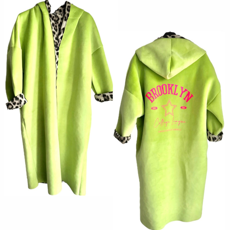 Aufsehen erregender Softshell Mantel "BROOKLYN" aus samtig weichem Material und Leo-Akzenten. Dieser Mantel überzeugt durch einen lässigen Schnitt mit modischer Kapuze. Er ist hellgrün mit einem ausrucksstarken, großen neonpink farbigen Print auf dem Rücken. Innen ist die Jacke und die Kapuze mit einem leichtem Sweatshirtstoff in allover Leo-Print gefüttert. Das ultraweiche Material bietet eine luxuriöse Haptik, ein angenehmes Tragegefühl und hält außerdem schön warm - anziehen und wohlfühlen. Was für ein Hammerteil! 🍏💕