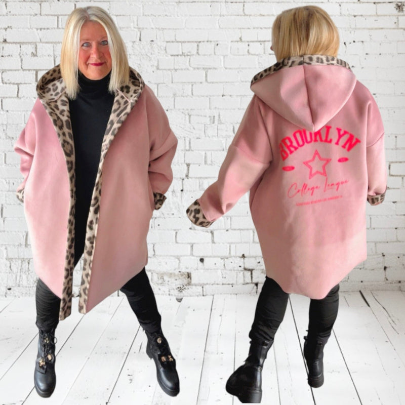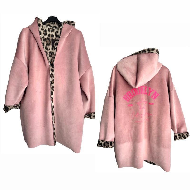 Aufsehen erregender Softshell Mantel "BROOKLYN" aus samtig weichem Material und Leo-Akzenten. Dieser Mantel überzeugt durch einen lässigen Schnitt mit modischer Kapuze. Er ist altrosé mit einem ausrucksstarken, großen neonpink farbigen Print auf dem Rücken. Innen ist die Jacke und die Kapuze mit einem leichtem Sweatshirtstoff in allover Leo-Print gefüttert. Das ultraweiche Material bietet eine luxuriöse Haptik, ein angenehmes Tragegefühl und hält außerdem schön warm - anziehen und wohlfühlen. Was für ein Hammerteil! 💕
