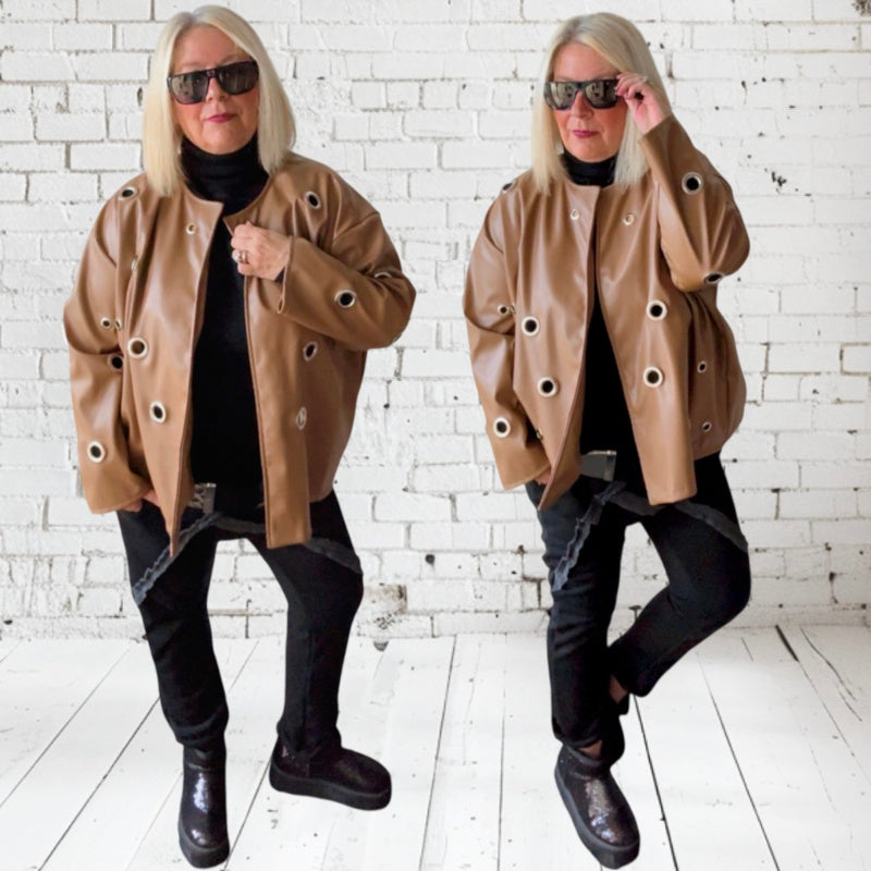 Unsere stylische Kunstlederjacke "EYELETTS" mit silberfarbigen Ösen ist ein wahrer Eyecatcher! Die leichte Damenjacke ist ein offenes Modell aus veganem Leder und als Highlight verziert mit dekorativen silberfarbigen Ringen vorne und an den Ärmeln. Kombiniere mit einem Rollkragen Pullover oder Top für einen ausgefallenen, modischen Look. Die Jacke hat keine Schließen und wird offen getragen. Sie hat eine komfortable "Happy Size" - in 3 schönen Farben 🖤🍂