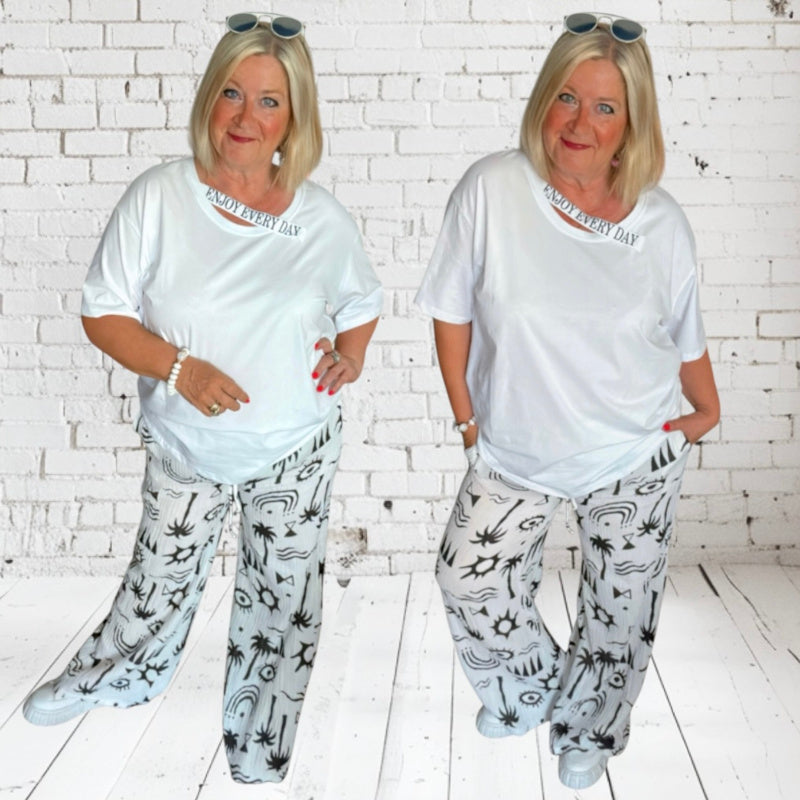 Unser T-Shirt "ENJOY" vereint coolen Streetstyle mit lässigen Komfort. Verziert wird das Shirt mit einem im Ausschnitt eingesetzten Schriftzug "ENJOY EVERY DAY" und verleiht ihm einen stylischen Akzent und macht es zu einem modischen Hingucker. Der hochwertig gearbeitete Rundhals-Ausschnitt und der kastige Schnitt sorgen für eine bequeme Passform. Dank des hochwertigen Baumwollmixes mit Elastan bietet es einen hohen Tragekomfort. - in 2 Farben 🤍🖤- Farben: weiß, schwarz
