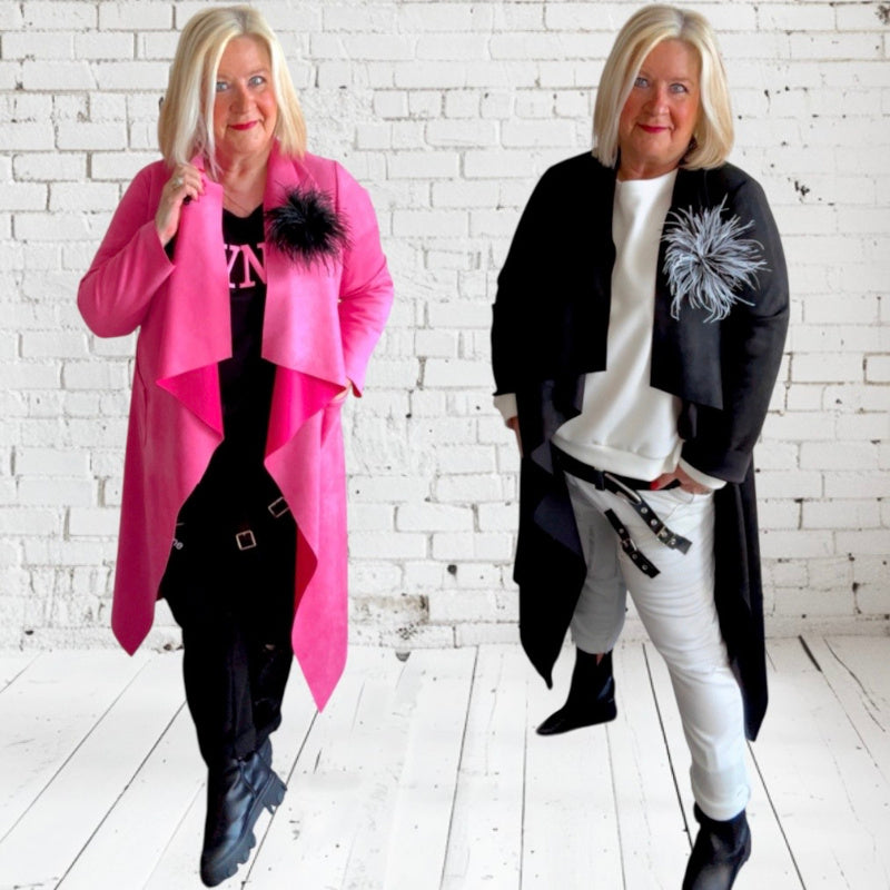 Moderner, weich fließender High-Quality-Mantel „GRACE“ aus Velour mit einem großen, lockeren Schalkragen und zwei aufgesetzten Taschen. Der Velourmantel vereint Komfort und Style. Der hochwertige Materialmix sorgt für ein weiches Tragegefühl und eine bequeme Passform. Ein wunderbarer Klassiker - in 2 Farben 🖤🩷